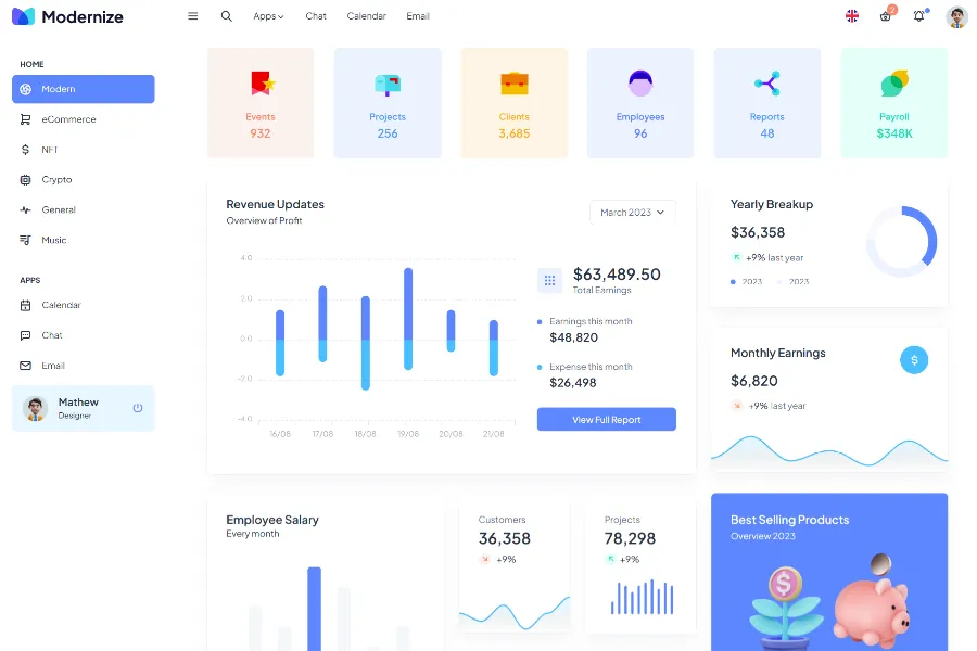 Modernize Bootstrap 5 is a premium admin dashboard template perfect for creating a web app in 2025. It has a very modern and sleek design with a professional look. This template gives a bird's-eye view of your operations and helps make informed decisions with comprehensive analytics visualization.