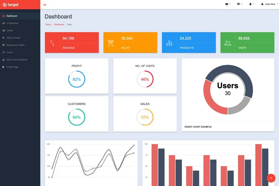 Target is a super responsive admin panel template that does not lag any of the things that a professional set should have in its repository. It's a simple dashboard HTML template that has all the things on the front. The header has all the necessary things like inbox, task scheduler, notifications, and the profile section that every dashboard has.