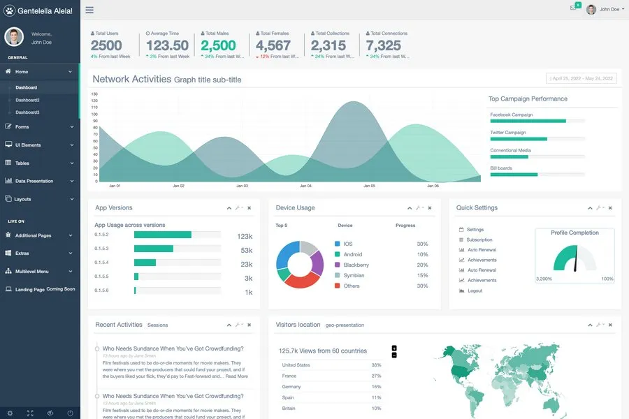 If you want a template to make a very nicely appealing dashboard on your website, Aba is the one for you. This is a heaven of eye candy for your control panel. Every element on this template has been designed nicely to suit and fit nicely on a single page with the best look. It makes navigation easy and fast. Large icons, nigger ad cleaner card, and graphically intense charts are elegant. The activity feed on this template is highly detailed, and you can also add photos and big icons to this element.