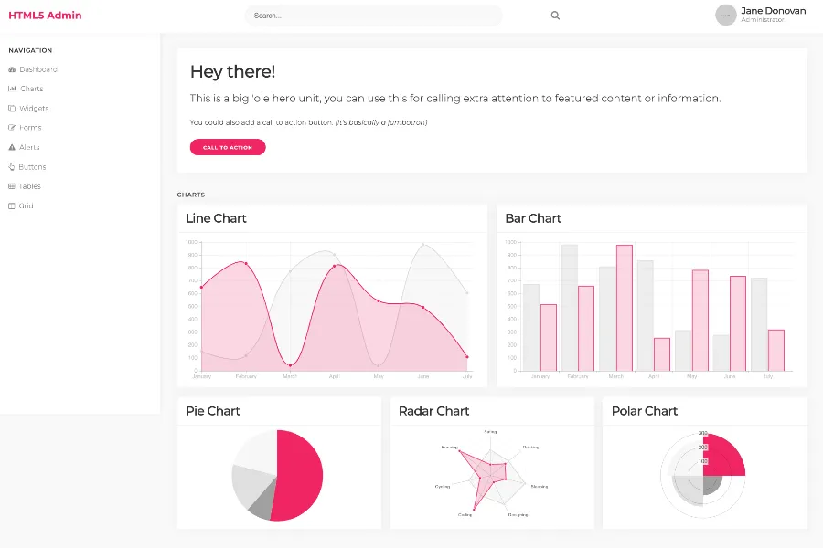 This template includes all the icons and components that are needed to set up a simple admin panel with all the basics. Varieties kind of charts has been added. Components like forms, grids, and buttons are included with different styles and color options.