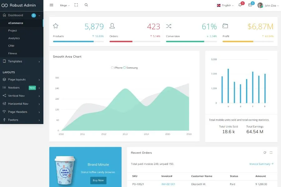 This template is filled up with big widgets, featureful components. All the widgets and components have clean and clear coloring and font options. This template is very useful for SaaS management, and monitoring IT has a big chart with a lot of information showing to the admin. Transition is also a beautiful part of this template. Smooth ad clean transitions make it feel snappier and more user-friendly. With all the essential UI elements, you will be getting specialized pages and elements like pricing tables, e-commerce management, and project management.