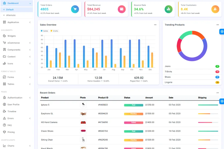 You can manage your e-commerce invoices from the home menu and also see all the analytical data from your team members from provided widgets. The super clean and clear codes also make it easy to set up pages.