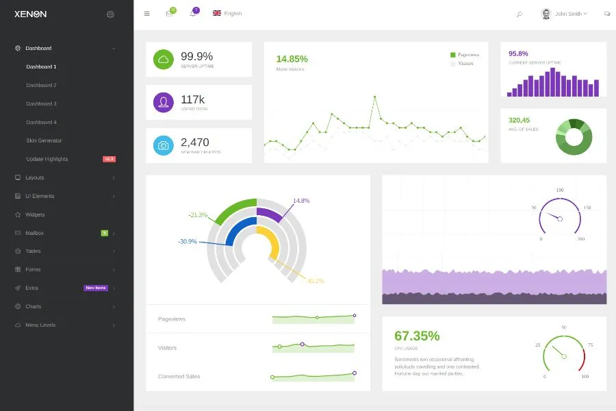 It has a ton of pre-built templates to choose from. The all graphical page interface provides a lot of information for the analytical admins. E-mails, to-to, messenger, and calendar apps are intuitive and very easy to set up. To keep everything versatile, it has a portfolio pre-loaded template for the creative ones.